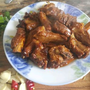 适量油,加入姜丝,蒜片,八角炒一下,再加入一平勺郫县豆瓣酱抄一下,加入炖好的排骨翻炒一下,最后加入适量老抽。