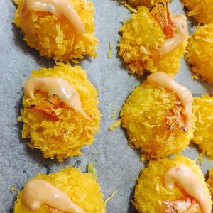 土豆泥弄成一个个饼摊开放上虾,再沾一层鸡蛋液,再裹上面包糠。放入铁盘中,铺上吸油纸