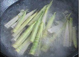 水煮开后放入春笋,再次煮开后煮半分钟,这叫焯水;从锅中取出后用水冲凉备用;
