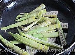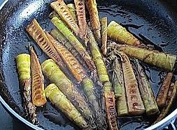 热锅冷油,比平时炒菜要适当多放点油,加入春笋翻炒;
