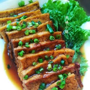 锅中留底油,中火,放入蒜片、葱花炒香,加入高汤,烧开后倒入煎好的豆腐,汤水没至豆腐,再加入生抽、盐、糖,大火烧开转小火;