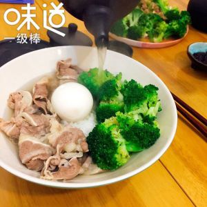 吃:吃的时候把苦瓜汤淋在饭就可以开吃了;但最好准备好沙茶酱;牛肉白灼的没味道,配着沙茶酱吃比较好吃。个人认为牛肉和苦瓜最搭所以这么搭配着来吃。