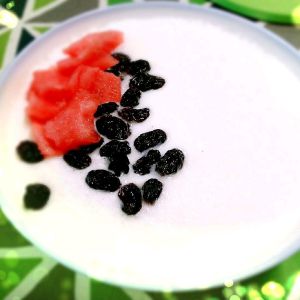 蒸好,待温凉放入冰箱冷藏。吃时放入葡萄干,蜜豆都可以!