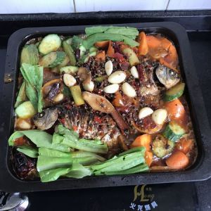 倒在烤好的鱼上面,加入切好的胡萝卜,黄瓜,(也可以放入菜花,土豆,白菜等其他的蔬菜)放在火上继续烤制,等蔬菜入味就可以端下来了