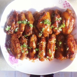 油微微热的时候、放入切好的葱姜蒜沫爆香、然后放入鸡翅、翻炒几下、倒入酱油炒至鸡翅金黄色!