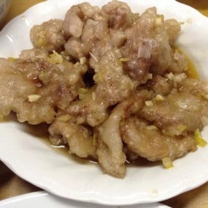 坐锅烧油,油烧到七成热,顺着锅边把肉片沾匀淀粉糊往锅里一片一片的下,先一半一半的炸定型捞出,待油温升高全部放进锅里高火炸,炸至金黄捞出备用!