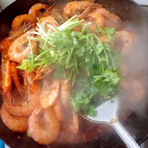 然后倒入之前过油的虾,改中火盖盖焖三分钟,后改大火翻炒15秒,倒入淀粉勾芡