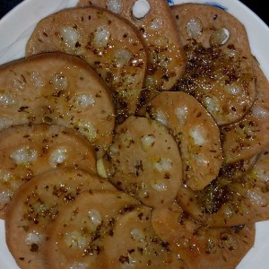 把晾凉的莲藕切成厚片摆盘,撒上白糖,干桂花,再上笼蒸15分钟~