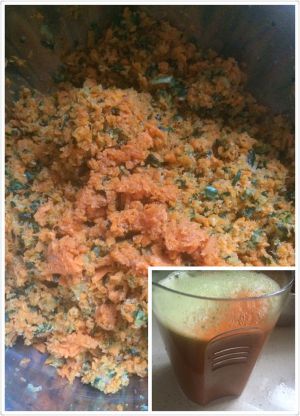 胡萝卜(增加毛亮度),黄瓜放榨汁机里,榨成汁渣分离开的。