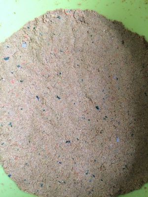 找个大盆,将玉米面,豆粕或豆粉,麸皮(夏天给狗吃防上火),鱼粉或骨粉拌匀。