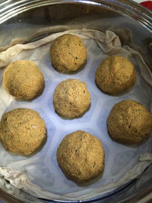 锅里放足够量的水,铺上笼布,将发好的面团分成若干份,按压圆,没办法揉成面团,所以抓一团按压几下就成圆球了,就可以蒸了,蒸20到30分钟后出锅。
