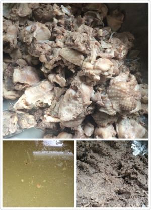 买鸡架三个,剁碎,高压锅压2小时炖烂,汤和骨架分离出来,放凉,将骨架抓碎成泥。