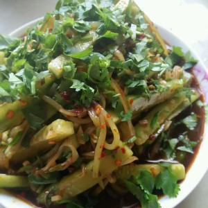 放入酱油,醋,香菜(留一点),搅拌。就可以了。放在盘子里,再洒上剩下的香菜。
