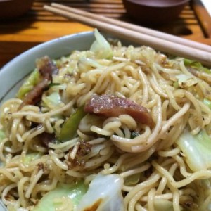 放入备好的熟面条,一起翻炒,把面条和菜炒均匀后放进香肠丝,滴少量酱油,可以使炒面色泽更好,最后撒少量细盐,全部炒匀后起锅。