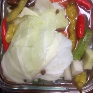 将晾干的菜均匀放入干净无油无味儿的密封器皿,加入凉透的调料水和小米椒、辣椒,密封阴凉处保存三天即可食用,如果天气热,要每天打开一下,将发酵的气体放出。天气冷可以延长密封时间。