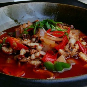 倒入之前的八爪鱼,并倒入适量的啤酒,进行翻炒