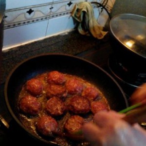 往锅中倒油,油烧热,把丸子搓好,放入锅中