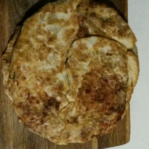 锅里放油 等油稍微热点 把刚才的饼用手按压成这个样子 一定用手 用擀面杖里面的馅会漏出来