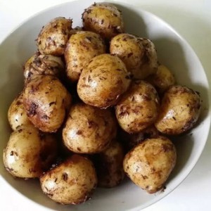 小土豆洗干净连皮煮熟捞出来,新土豆很容易煮熟的,大概十多分钟就好了,用筷子戳一下能轻易戳个洞洞就好了,一定要连皮煮哈,去掉皮煮土豆煮烂就没口感了哦