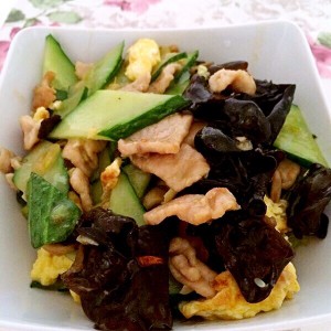依次加入黄花菜、木耳、黄瓜、鸡蛋,炒熟