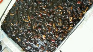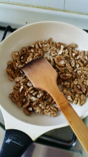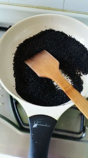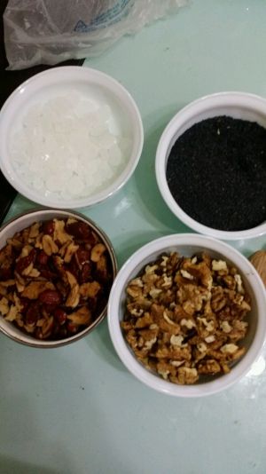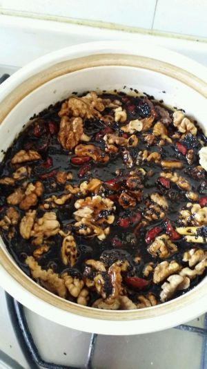 放入核桃,黑芝麻,我把它倒入砂锅熬,一般熬中药都是放砂锅熬