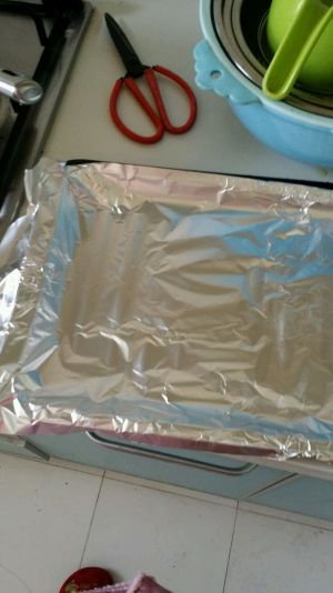 烤盘铺上锡纸,抹上油。有的用塑料布,可能好撕一点,但塑料布加热会析出有毒物质