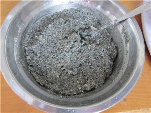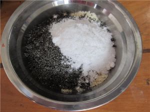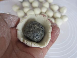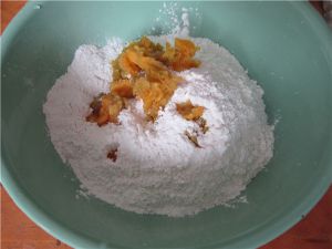 红薯泥放入面粉中,将温水倒入糯米粉中,边倒边搅。
