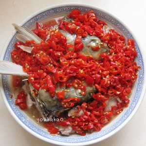 鱼头清洗干净,放入大碗里,还有少许的鱼肉,撒少许的白胡椒粉,腌渍片刻;