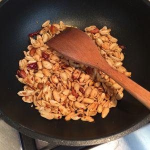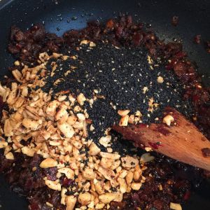 加入花生碎和黑芝麻(白芝麻也可,白芝麻香,黑芝麻有营养),炒匀。