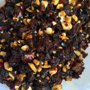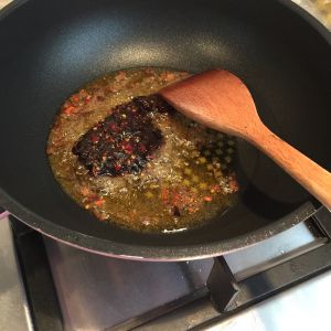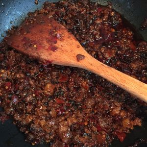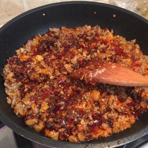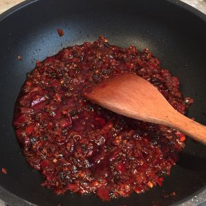 加入郫县豆瓣酱,小火炒20分钟,盛出。