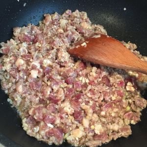 锅内从新倒油,油热后放入腌好的牛肉翻炒。