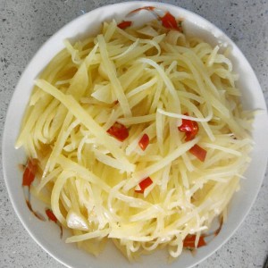油烧热后放入蒜头和辣椒。煸出香味后倒入土豆丝,