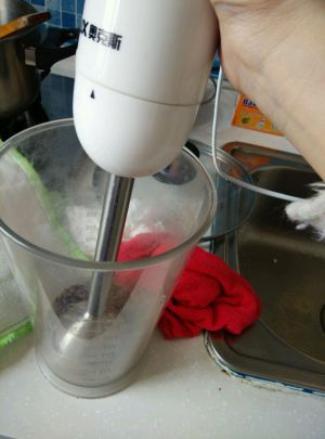 有料理机的用料理机打成粉,我只有手持料理棒,打的不是很细腻,所以用纱网过滤了一下。