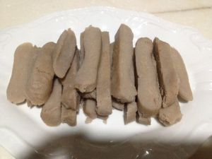 吃时切成你自己喜欢的形状,蘸蒜泥吃味道最正,也可以拌自己喜欢的口味
