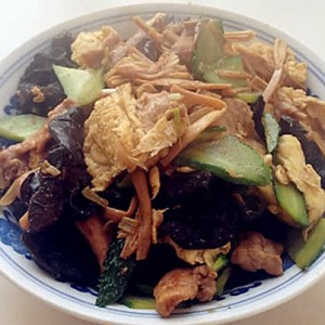最后锅里放底油,油温3成热放葱姜末,炒2下就放入木耳翻炒,炒7、8下再依次放入黄花、肉片翻炒。放酱油。然后放入鸡蛋和黄瓜片一起翻炒。放盐、五香粉。临出锅前依个人口味放入少许香油。