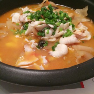 炖汤的同时,用淀粉放水调成勾芡的样子,鱼片薄薄地挂上一层芡,放进准备好的鱼汤里,1-2分钟即可起锅,撒葱。