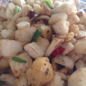 把馍块放进去,翻几下,加上葱花,放入盐和胡椒炒制有点焦装即可出锅