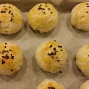 带馅面团放入烤盘,刷上蛋液,撒上芝麻