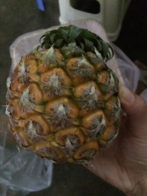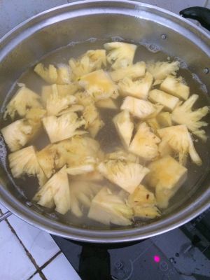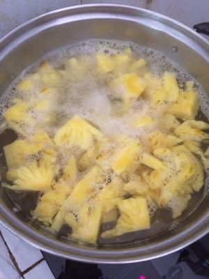 将菠萝切成小块,放入锅中,加入矿泉水,冰糖,待冰糖煮化后,加入切好的菠萝小块,小火慢煮