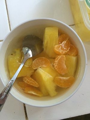 我自己比较喜欢吃橘子,所以就放了一些橘子在碗中和菠萝一块儿吃。这样就完成了,糖水菠萝