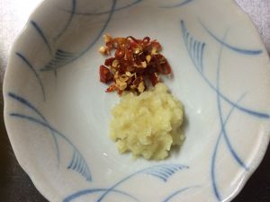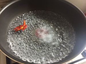 挑出煮软的干辣椒切丝,把蒜捣成蒜泥