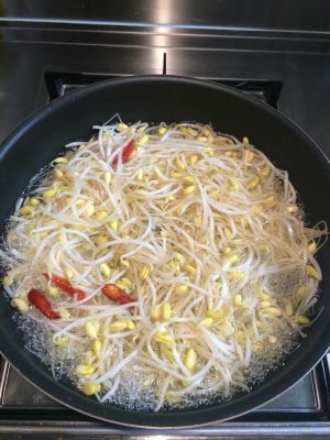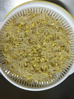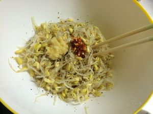 晾干水分的豆芽放入容器中跟着继续放入胡椒粉,鸡精,芝麻油,辣椒,蒜泥,芝麻,拌均匀。(黑色颗粒为黑胡椒粉粒)