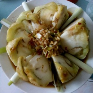 把茄子去皮。蒸熟,然后调汁。准备一碗。切好葱末。蒜末姜末辣椒末。放在一起。用食醋。味极鲜。盐调味。看个人口味适量调放。也可以放点鸡精。