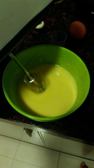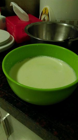 牛奶慢慢加入到蛋液,一边倒一边搅拌,以免烫熟蛋液。加完之后,奶蛋液倒回锅中煮微沸,待凉后放入冰箱冷冻。隔夜也好,四五个钟之后也罢,结了就行。
