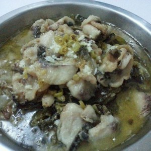 酸菜炒香后加入鱼汤烧开盐,味,糖调味