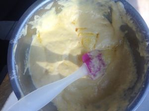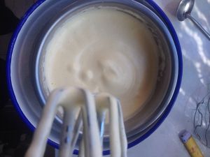 三个蛋提前拿出冰箱放到常温,打入盆中加入35g白糖和10滴柠檬汁电动打蛋器打至全发。就是打蛋器上的蛋不轻易脱落,痕迹不会立即消失~