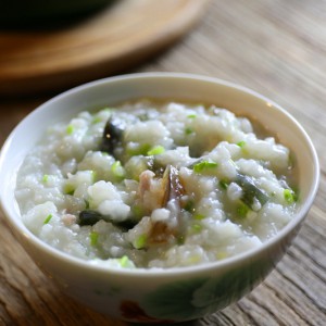 大米淘洗后浸泡,瘦肉切丝,生姜、小葱切末。