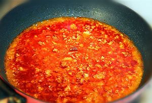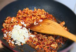 放入豆瓣酱和辣椒面煸炒出红油,然后再放入蒜末煸炒出香味。
