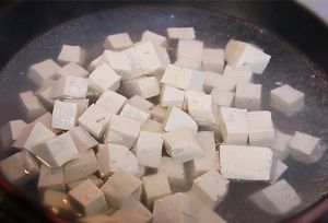 锅中加入适量的水,水开后放入豆腐焯一分钟然后捞出备用。