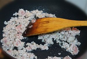 锅中加适量底油,然后放入肉馅,煸炒成熟。